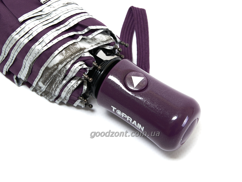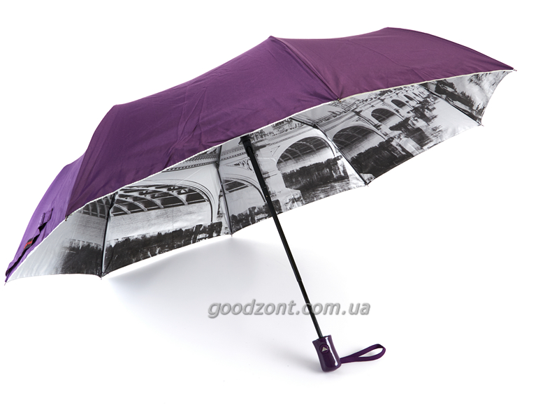 Жіночий однотонний зонтик-напівавтомат з містами під куполом має оригінальний дизайн і міцність. На внутрішній стороні купола парасольки надруковано принт з відомими містами на сріблястому фоні. Парасолька для жінок має 9 карбонових спиць, систему антивітер і зручну ручку.
